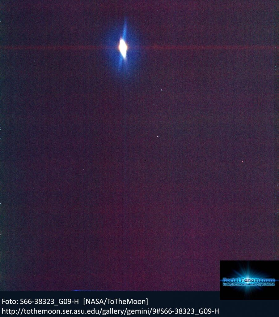Objeto intensamente luminoso, próximo à Gemini 9. A NASA alega que o objeto registrado era a Lua.