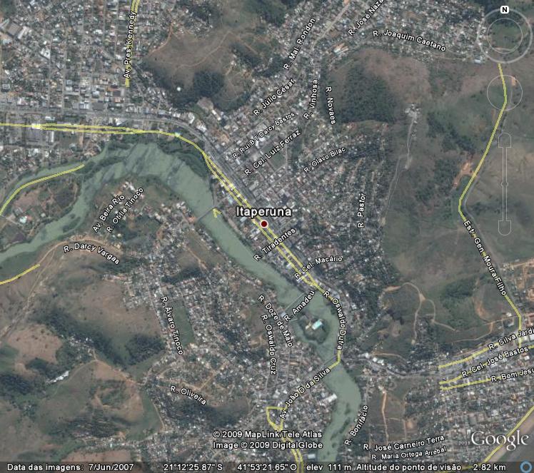 Na imagem acima temos uma vista aérea de Itaperuna, Rio de Janeiro. Cortando a cidade temos o Rio Muriaé. Em geral, as testemunham encontravam-se na margem à direita, na fotografia. Na imagem acima temos a localização da rua Tiradentes, que está orientada de Sudeste à Nordeste. As testemunhas do caso nº3 encontravam-se no começo da rua, em sua região afastada do rio. Esse posicionamento faria com que Venus estivesse, aparentemente, acima do Morro, circundado pela Rua Darcy Vargas, no lado esquerdo da imagem, do outro lado do rio. Sendo assim, a primeira parte do Caso nº 3 explica-se perfeitamente. Já a segunda parte do caso, ocorrido por volta das 21:15 hs, não pode ser explicada desta forma, pois o objeto estava acima de uma arvore e apresentou deslocamento próprio. Além disso, os detalhes descritos coincidem perfeitamente com outros avistamentos relatados na mesma cidade naquela época e com os casos gaúchos.