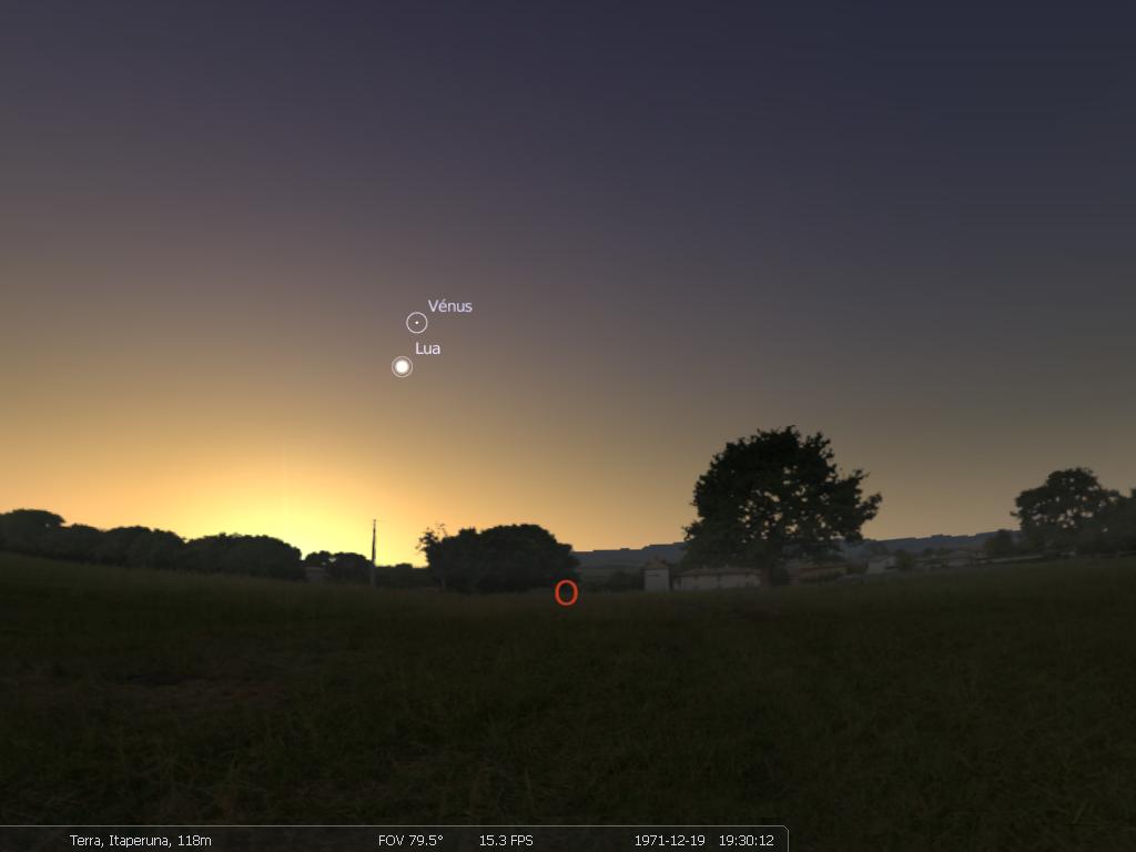 Carta celeste de Itaperuna para 19 de dezembro de 1971 [19:30 hs], olhando oeste. Em 19 de dezembro de 1971, às 19:30 hs, Vênus estava 25º acima do horizonte, neste horário, e pouco mais de 15º à direita do ponto cardeal Oeste. Embora na carta acima tenhamos a indicação da posição da Lua ela estava saindo da fase Nova e era muito pouco nítida na data da observação.