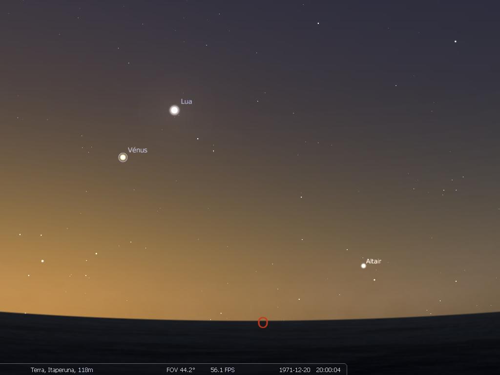 Carta Celeste de Itaperuna para 20 de dezembro de 1971 – horário 20:00 hs, olhando oeste. Na carta celeste temos o Planeta Venus com pouca variação em relação ao dia anterior. Embora na carta acima tenhamos a indicação da posição da Lua ela estava saindo da fase Nova e era muito pouco nítida na data da observação.