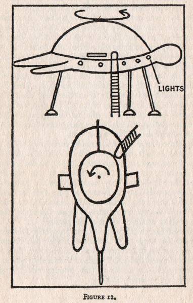 Finalmente, um daqueles homens se levantou e me fez sinal para que o acompanhasse. Os outros continuaram sentados, sem olhar para mim. Caminhamos na direção da saleta de entrada e fomos até a porta de entrada, que estava aberta de novo, com a escada já desenrolada. Não descemos, entretanto, pois o homem fez sinal para que o acompanhasse na direção da plataforma que existia dos dois lados da porta. Essa plataforma rodeava o aparelho e, embora estreita, permitia que se caminhasse sobre o mesmo, para os dois lados. Fomos primeiro para a frente. Notei então uma espécie de protuberância metálica, de forma quadrada, que se projetava para fora, para o lado (havia uma coisa igual do lado oposto), bem encaixada no corpo do aparelho. Se essas peças não fossem tão pequenas, julgaria que eram asas para ajudar no voo. Pelo seu aspecto, penso que talvez servissem para se mover para cima ou para baixo, orientando a subida ou descida. Confesso, contudo, que em nenhum momento, mesmo quando o aparelho levantou voo, notei qualquer movimento. Não sei portanto explicar para que serviam.