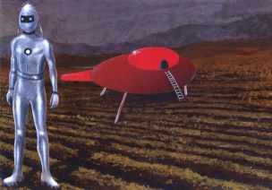 Depois de também vista a parte de trás do aparelho, voltamos até a porta. O meu guia apontou para a escada e me fez sinal para que eu descesse. Obedeci. Quando pisei o chão olhei para cima. Ele ainda estava lá. Apontou então para ele mesmo, em seguida para a terra, para logo depois apontar para o céu, na direção do sul. A escada de metal começou a encolher, os degraus se arrumando uns em cima dos outros, como uma pilha de taboas. Quando chegou lá encima, a porta (que quando aberta era chão) começou, por sua vez, a subir até se encaixar na parede do aparelho – ficando invisível. As luzes dos esporões metálicos, dos faróis e do prato giratório ficaram mais fortes – enquanto este ultimo rodava cada vez mais depressa. O aparelho começou a subir lentamente na vertical. Nesse momento, as três hastes do tripé onde o mesmo estava pousado subiram para os lados, sendo que a peça inferior de cada uma (mais fina, roliça e terminando num pé alargado) começou a entrar na peça de cima (bem mais grossa e quadrada); quando isso acabou, a peça de cima começou a entrar para o fundo do aparelho. No fim não se via mais nada, o fundo se apresentava liso e polido como se aquele tripé nunca tivesse existido. Não consegui descobrir qualquer marca indicando o lugar onde as hastes se tinham encaixado. Aquela gente trabalhava bem.