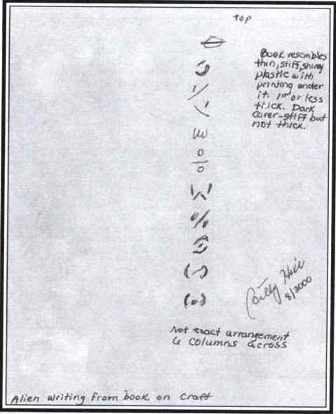 Eu sugeri que era necessário uma prova absoluta de que isso tivesse acontecido, talvez ele poderia me dar alguma coisa para levar de volta comigo. Ele concordou e perguntou o que eu gostaria. Olhei ao redor do quarto e encontrei um grande livro. perguntei se eu poderia levar isso comigo e ele concordou. Eu estava tão feliz e lhe agradeci. Abri o livro e encontrei simbolos descritos em colunas estreitas. Perguntou brincando se eu achava que eu pudesse lê-lo e eu disse que isso era impossível pois eu nunca tinha visto algo assim. Eu não estava lavando isso para fins de leitura, mas esta foi minha prova absoluta da experiência e eu poderia lembrar por muito tempo o que eu vivi. Depois eu perguntei de onde ele era e ele me perguntou se eu sabia tudo sobre o Universo. Eu disse não, mas gostaria de aprender. Ele foi para a parede e puxou um mapa”.