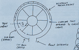 Nos chegamos a uma pequena clareira na floresta. Diante de nós estava um disco quase tão grande como a minha casa. Estava escuro, mas parecia ser metálico. Nenhuma luz ou janela era visível e eu tive a impressão de que estávamos nos aproximando por trás daquilo. Nós andamos um ou dois passos na rampa que nos levou à uma porta. Neste ponto, eu fiquei assustada novamente e me recusei a andar. O líder falou com firmeza, mas de uma forma gentil, ressaltando que eu não tinha razão para ter medo. Mas quanto mais atrazo eu causasse mais longe eu estaria do carro. Eu dei de ombros e concordeu que poderia acabar com isso, mas eu percebi que não havia muita escolha nessa situação.