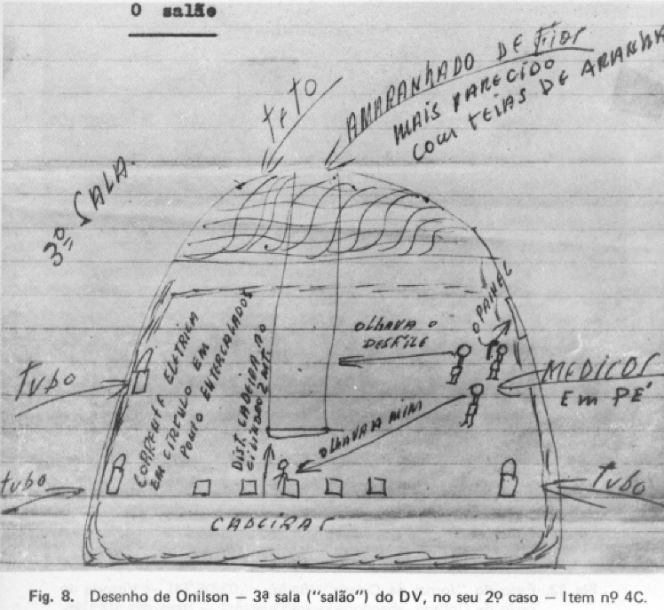 Esse ultimo salão que Onilson lembra ter avistado era em formato semi-cilíndrico, tendo 12 a 15 metros de diâmetro. Ele achava-se sentado numa cadeira, em fileira de 5 a 6 cadeiras colocadas no meio. Havia ainda à sua frente, no centro, um cilindro metálico brilhante, de uns 40 cm de diâmetro, que alcançava o teto do salão e que era de uma altura de uns 10 a 15 metros. No canto à sua esquerda, nada havia, mas à sua direita estavam em pé 3 pessoas encapuzadas, cujas roupas soltas estendiam-se até os pés. Deviam ter altura regular de 1,70 m. Onilson os denominava de “médicos”. Um deles estava sentado diante de uma tela. Outro olhava para Onilson e o terceiro observava alguns objetos presentes na sala.