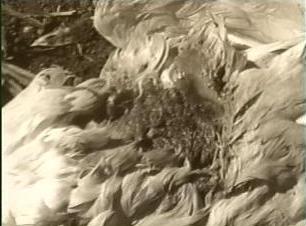 No dia seguinte, 25 de julho, na necropsia, percebemos de novo que a ave, do sexo feminino, não apresentava o odor característico de animal em decomposição, apesar de estar morta há quatro dias. Observou-se inicialmente que a ave teria sido atacada por garras em três regiões diferentes do corpo, duas na parte de trás e uma próxima ao pescoço. Existia um orifício de aproximadamente 10 cm. de diâmetro no peito e reparamos que a parte da pele que recobria o corte não fora extraída totalmente. Era como se conformasse uma tampa no local do orifício. Com uma pinça, o veterinário observou que o buraco era profundo, demonstrando não ter sido produzido por uma mordida comum. Abrindo o animal, não reparou qualquer falta de órgãos internos, mas encontrou apenas duas bolinhas de sangue coagulado. Retirou alguns órgãos, como o coração e o fígado, e notou que, no coração, não restava qualquer vestígio de sangue, revelando assim que havia sido retirado praticamente todo o sangue da ave. O fígado apresentava-se ligeiramente amarelado, como o das galinhas encontradas no bairro Boqueirão em Curitiba, demonstrando que, ou a ave consumia muito milho, ou era indício de alguma complicação mais séria.