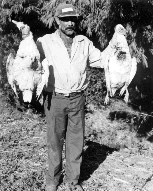 Chacareiro segurando dois gansos atacados em sua propriedade. [Crédito: Carlos Alberto Machado]
