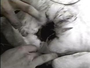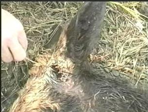 Corte profundo na traseira de um porco que sobreviveu à um ataque ocorrido em Araçoiaba da Serra (SP). Percebe-se o corte limpo, profundo e preciso. [Crédito: Carlos Alberto Machado]