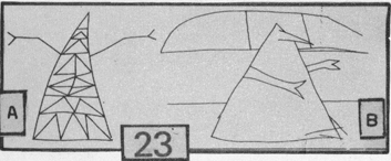 Havia uma entrada retangular por onde descia uma espécie de esteira rolante que não chegava a tocar o solo, apesar de parecer sólido. Na extremidade inferior dessa esteira, e como se fizesse parte integrante da mesma, havia um “vulto” (que parecia uma tela, mas não tinha aspecto “humanóide”) de forma geométrica, retangular, medindo mais ou menos 1,50 m de altura por 0,50 m de largura. Atrás do primeiro vulto, a uns 5,50 m em linha reta, na mesma esteira, havia outro, também imóvel; ambos sem nenhuma abertura nem luminosidade (veja setas pretas na fig. 22). A extremidade inferior da esteira estava a cerca de 5 m do observador, que pensou em perguntar o que faziam ali, mas não conseguiu falar.
