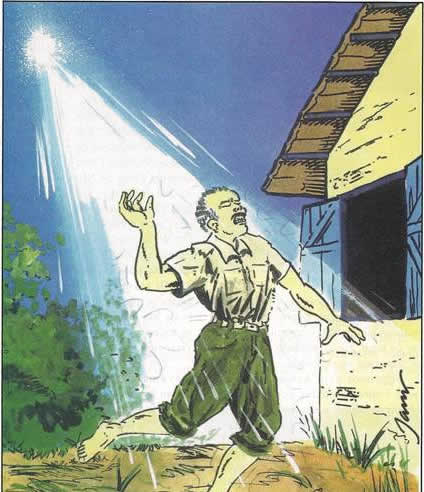 Representação do momento em que João Prestes é atingido pela luz misteriosa.