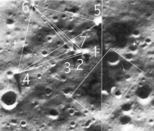 Fotografia da Lunar Orbiter 3, indicando uma cratera, com características estranhas, e uma área com solo, aparentemente revirado, presente nas imediações.