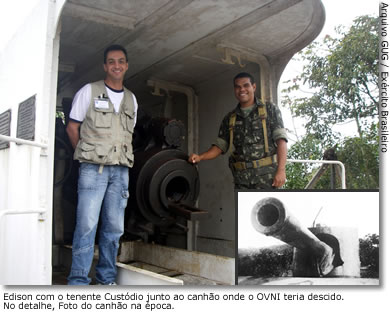 Edison com o tenente Custódio junto ao canhão onde o OVNI teria descido. No detalhe, foto do canhão na época.