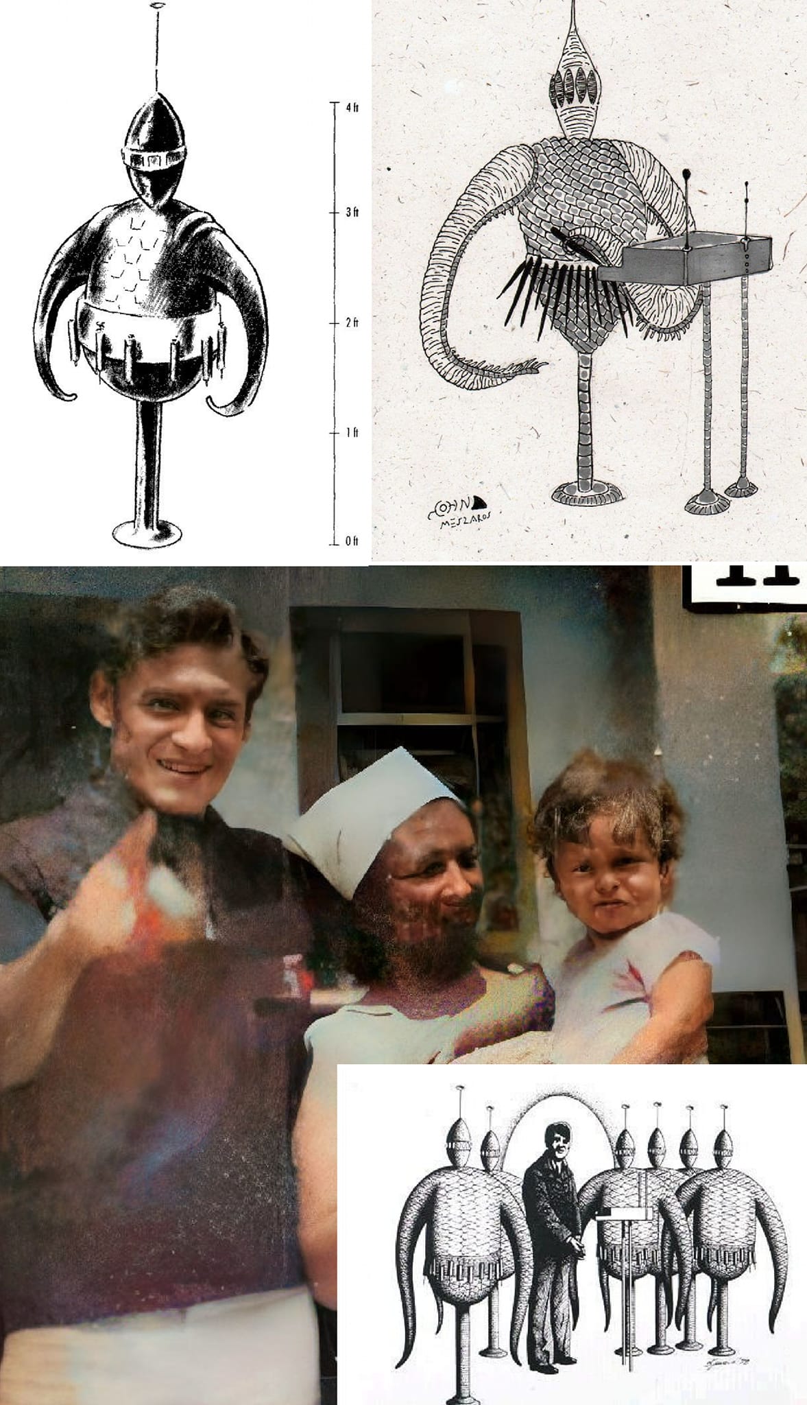 Quando estavam (vide fig 2) em posição normal, essa espécie de colher rodopiava tão velozmente, que era impossível segui-la com o olhar. Acendeu-se então, uma luz forte, azul, vinda do teto, os seres voltaram a ficar em pé, mas Antônio não conseguiu mais gritar. Então ele notou o que parecia um “pianinho”, denominado assim por ele, por ter “teclas” (vide fig.3). O “pianinho” chegava à altura do peito de Antônio, se apoiava em duas pernas, como um cavalete, e apresentava uma caixa de alumínio atrás, onde um ser, um de cada vez, se aproximava, vindo um de um lado, outro do outro, alternadamente. Introduzia uma “seringa” tirada da cintura, pois todos usavam um cinto em volta do tronco; apertava então uma tecla e cada vez surgia uma imagem diferente na parede do disco, pois nenhuma tela era visível. A imagem era colorida. A sequencia das imagens foi: