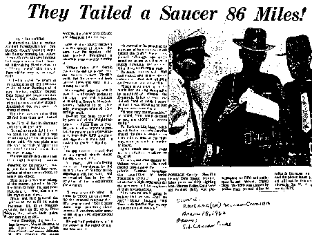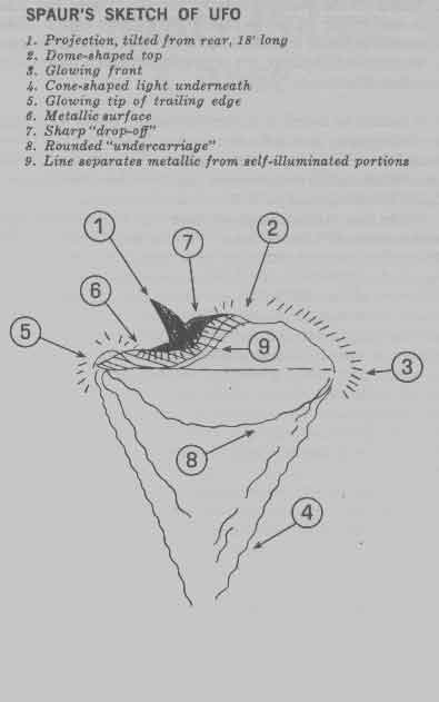 Enquanto ele voava por ali, eu estava de pé ao lado da radio-patrulha. Observei-o seguir direto acima de nós. Tinha o formato semelhante à um sorvete em cone com um pouco da parte superior derretida. A extremidade mais fina do cocuruto estava para baixo; a parte superior parecia-se com uma cúpula. Spaur e Neff desceram a estrada bem atrás dele. Segui atrás deles. Seguíamos a uma velocidade de 80 a 85 milhas por hora e umas duas vezes a 105 milhas por hora. Num determinado momento fiquei colado ao pára-choque de Spaur e verificamos um com o outro o que estávamos vendo. Estava bem na nossa frente, meia milha ou três quartos de milha mais adiante.